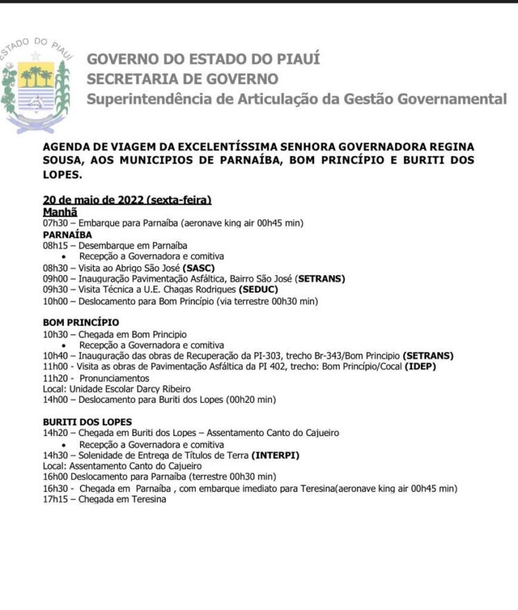 A governadora do Piauí, Regina Sousa, desembarca no aeroporto Dr. João Silva Filho nesta sexta-feira (20),para cumprir agenda na região norte. Ela visita e inaugura em Parnaíba, Bom Princípio e faz entrega de títulos de terra em Buriti dos Lopes: Confira a programação completa: