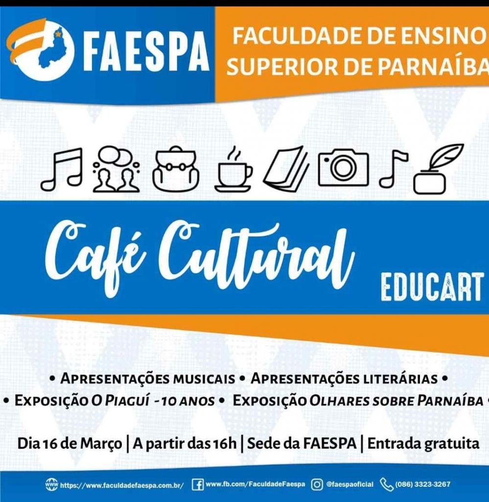 Amanhã sábado dia (16) vai acontecer o 1ª Café Cultural na Faculdade de Ensino Superior de Parnaíba a partir 16h com varias apresentações musicais, artesanatos e apresentações literárias. Ficou curioso? Ainda tem mais vou contar. Uma superexposição do Jornal “O PIAGUÍ” – 10 Anos e Exposição “Olhares sobre Parnaíba”.
