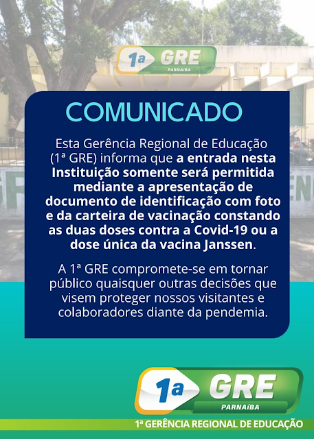 A Primeira Gerência Regional de Parnaíba, que tem como gerente a professora Safira Maria Veras do Santos, emitiu comunicado informando que só será permito o acesso naquela instituição mediante apresentação de comprovantes de vacinação. Eis o comunicado: