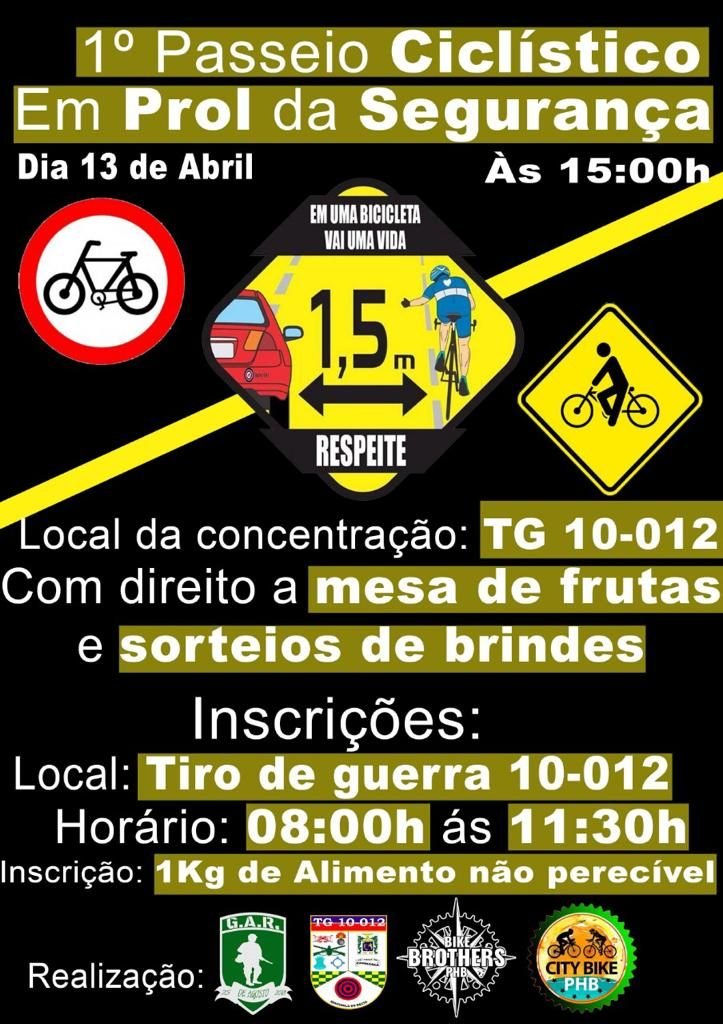 O Grupo de Atiradores Reservistas (GAR), TG 10-102,Bike Brothers e City Bike estão organizando o 1º Passeio Ciclístico em Prol da segurança que será no dia 13 de abril com saída do TG 10-012. Para participar do evento, os interessados podem comparecer de segunda a sexta das 08h às 11h30 no Tiro de Guerra 10-012, na Avenida São Sebastião, cuja inscrição é de 1 kg de alimento não perecível.