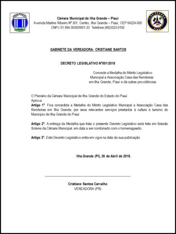 A propositura do Projeto de Decreto Legislativo de concessão da Medalha do Mérito Legislativo Municipal já passou em primeira votação nesta quinta-feira(26/04) em Sessão Ordinária na Câmara Municipal da Ilha Grande do Piaui.