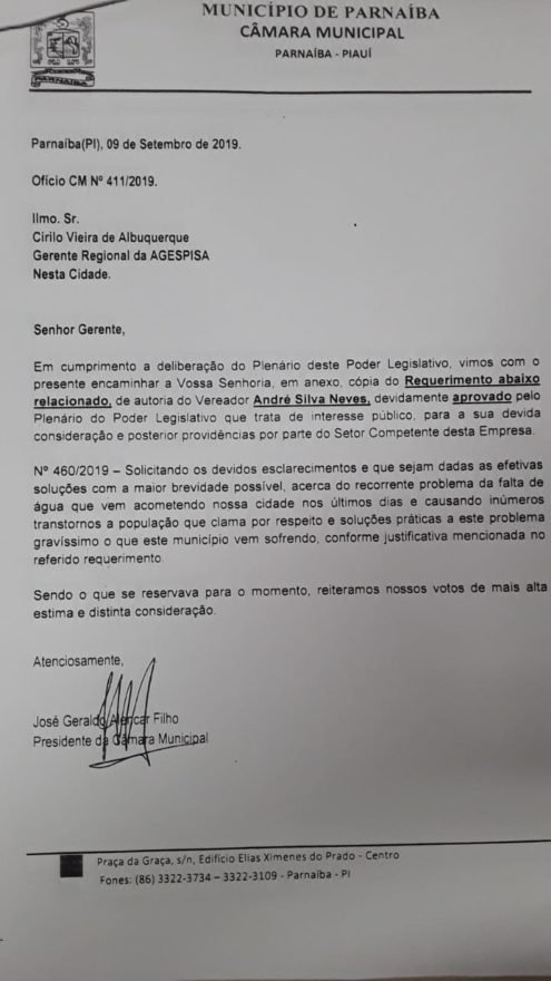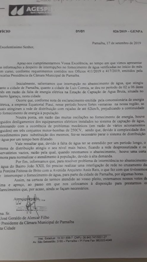 O gerente regional da Agespisa em Parnaíba, Cirilo Albuquerque, encaminhou ofício ao gabinete do vereador André Neves na – Câmara Municipal de Parnaíba – no qual apresenta os esclarecimentos sobre a interrupção no fornecimento de água que causou transtornos à população durante alguns dias do mês de setembro passado.