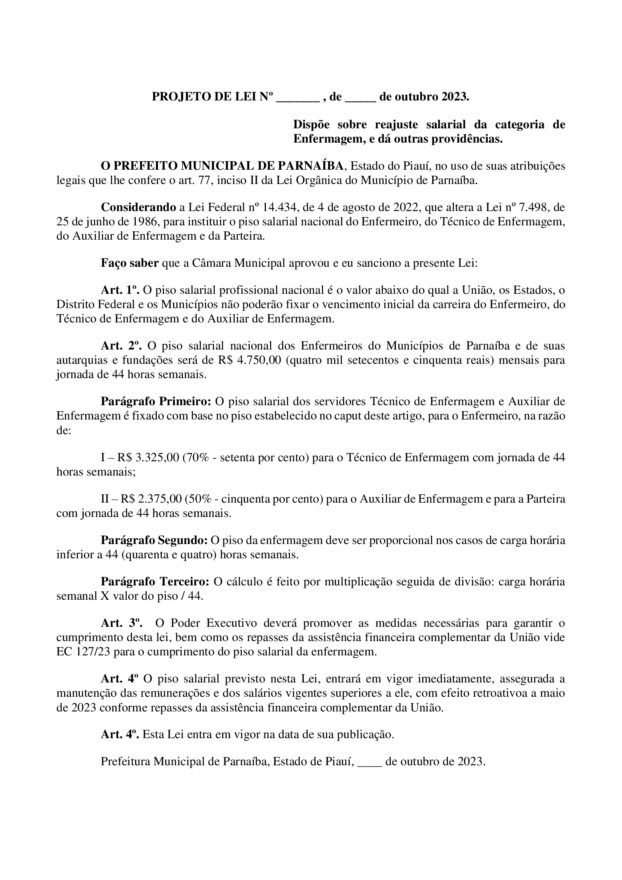 Na última semana depois de idas e vindas, no Congresso, STF e no Ministério da Saúde, o Prefeito de Parnaíba Mão Santa já com dinheiro em Caixa referente aos meses de Maio, Junho, Julho e Agosto, manda para a câmara municipal o PL 091 que estabelece o pagamento dos valores já recebidos pelo município a Enfermagem Municipal, fato que frustou a categoria parcialmente, pois a lei só faz menção ao pagamento do retroativo dos valores recebidos pelo município e não do piso salarial de categoria de fato,pois não referida lei não levar em consideração a implantação do piso no salário base, com a garantia da progressão e promoção do Plano de cargos da Saúde, incidência na Insalubridade e adicional noturno da categoria, ou seja não garante o piso da categoria.
