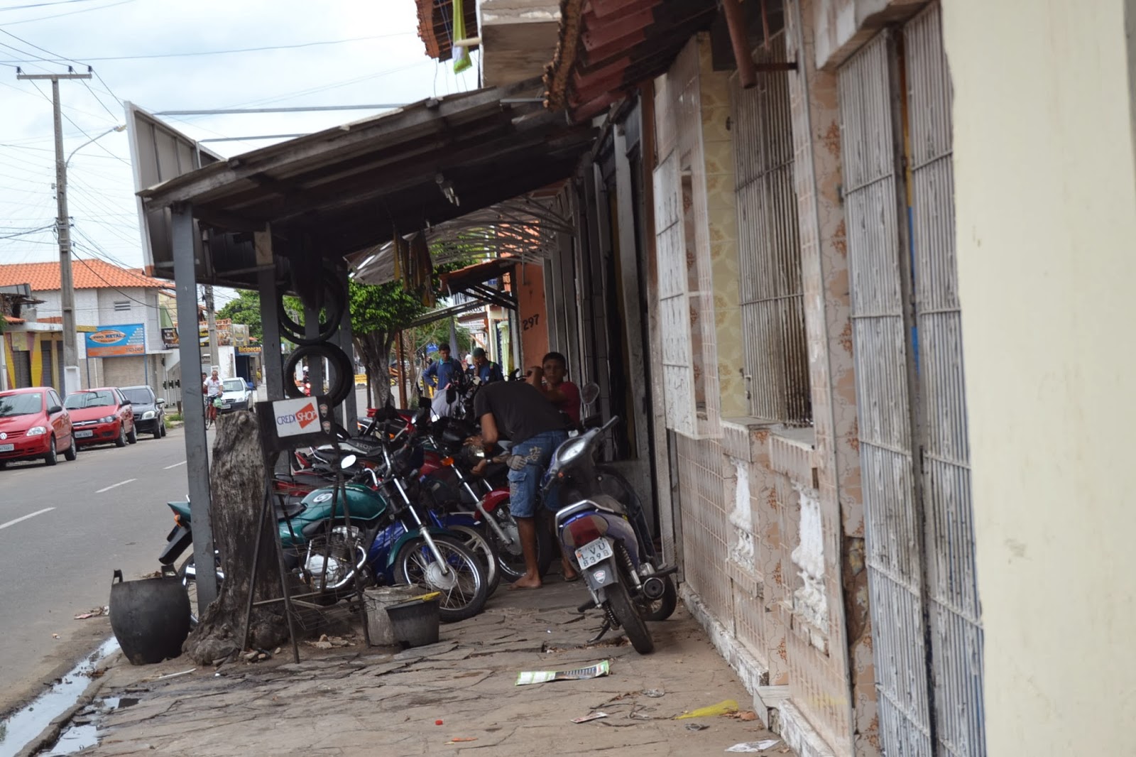 que oficinas de bicicletas e motos, mercadorias de comércios, cadeiras de bares