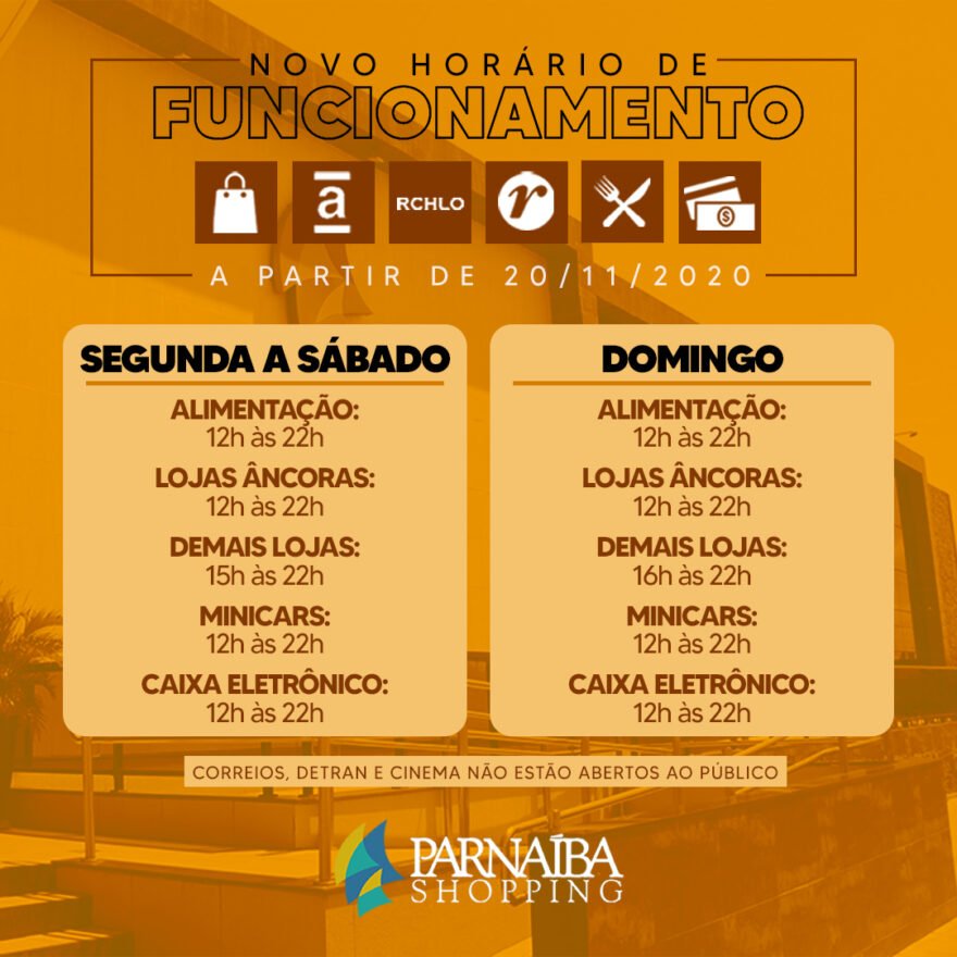 A partir desta sexta-feira, dia 20 de novembro, a praça de alimentação do Parnaíba Shopping, assim como as lojas âncoras (Americanas, Renner e Riachuelo), estarão com novo horário de funcionamento: 12h às 22h, de segunda a sexta-feira.
