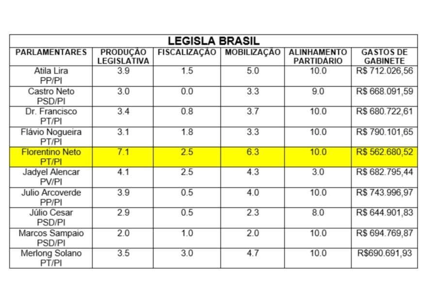 O relatório da Legisla Brasil sobre os 500 dias de mandato avalia a perfomance dos 513 deputados federais a partir de dados quantitativos fornecidos pela própria Câmara. No Piauí, o deputado federal Florentino Neto (PT) lidera o ranking de posicionamento e se destaca pelo desempenho satisfatório em todos os aspectos do trabalho legislativo. Ele obteve nota 7.1 no quesito produção legislativa. No segundo lugar, empatados, estão os deputados Atila Filho e Julio Arcoverde, com 3.9 no mesmo quesito.