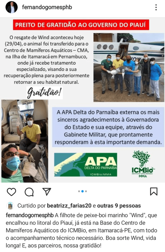 O Governo do Piauí, por determinação da governadora Regina Sousa, disponibilizou a aeronave para o transporte de Wind, que estava debilitada e não suportaria uma viagem de carro até a unidade do ICMBio/CMA na Ilha de Itamaracá, referência no manejo do peixe-boi. A viagem foi tranquila, segundo os veterinários que acompanharam a filhote de peixe-boi.