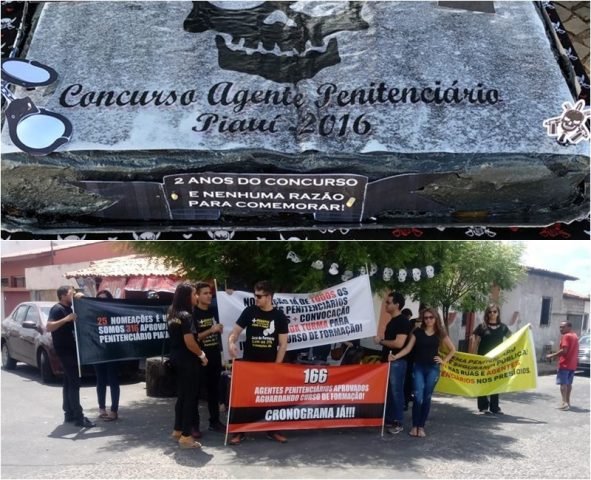 “Dois anos de concurso e nenhuma razão para comemorar”, é assim que foi decorado o bolo da “descomemoração” feito por aprovados no concurso para agente penitenciário do Piauí. Eles estiveram reunidos em frende a sede da TV Cidade verde pedindo pela nomeação imediata dos candidatos aprovados no certame. Nesta segunda (03/09), a emissora realizou o primeiro debate com os candidatos ao Governo do Piauí.