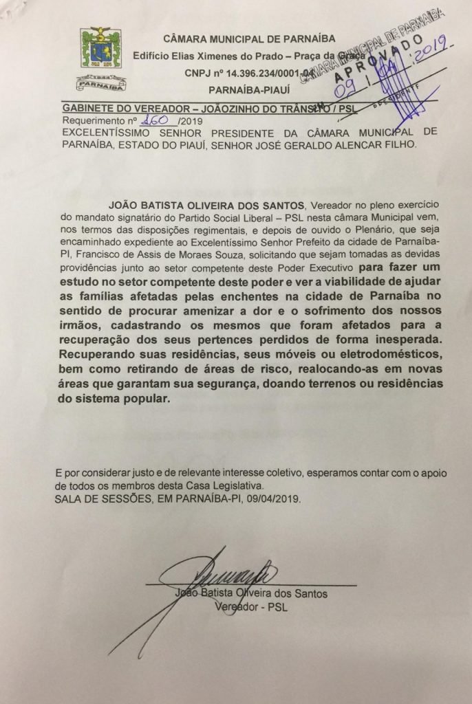 O vereador Joãozinho do Trânsito (PSL) nesta terça-feira (09), por exemplo, solicitou para que o setor competente da prefeitura intensifique a ajuda às famílias afetadas pelas enchentes na cidade, no sentido de procurar amenizar a dor e o sofrimento das vítimas por meio do Requerimento nº160/2019.