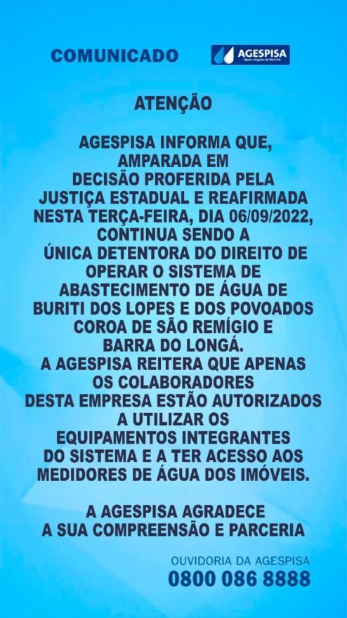 Atenção Buriti dos Lopes: Agespisa informa Posted by Bernardo Silva on 6 de setembro de 2022 in Diversos Diversos