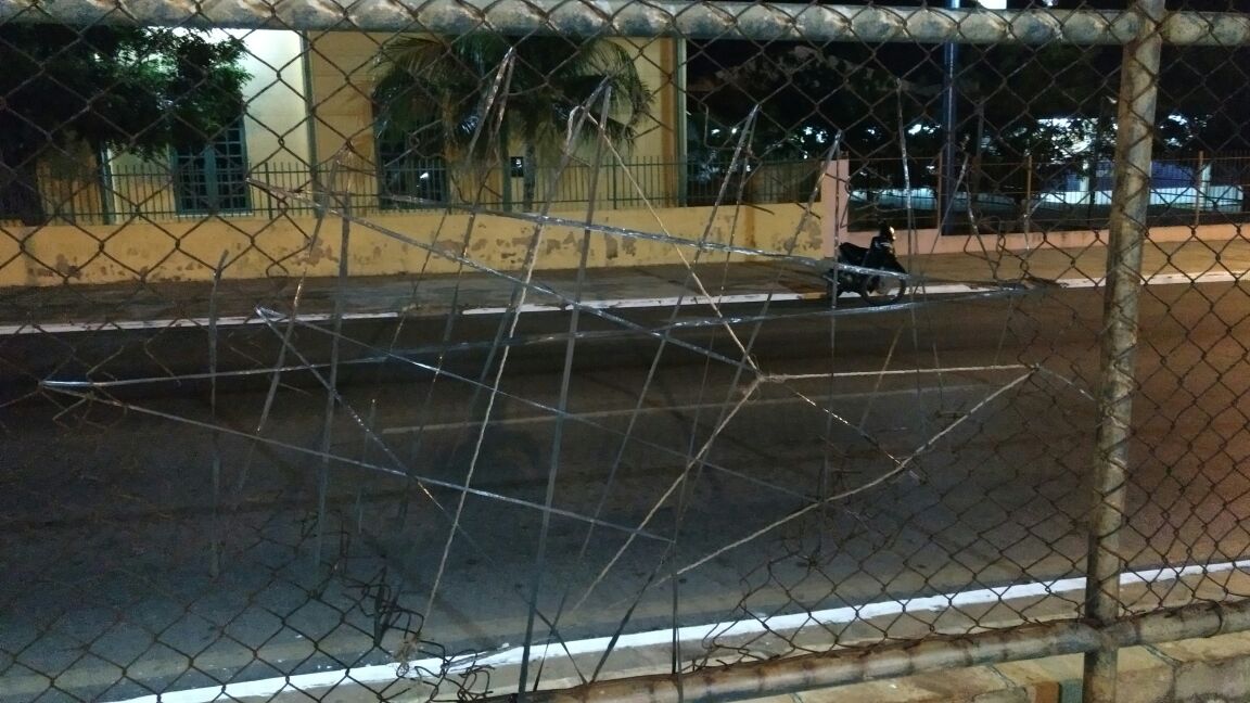 | Atletas usaram barbante de nylon para fechar buracos da quadra e impedir que a bola caia na avenida e cause acidentes |