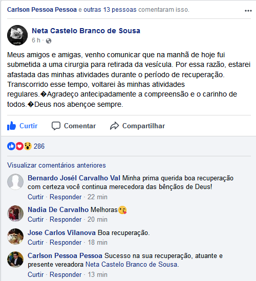 Vereadora Neta é submetida a cirúrgia para retirada de vesícula
