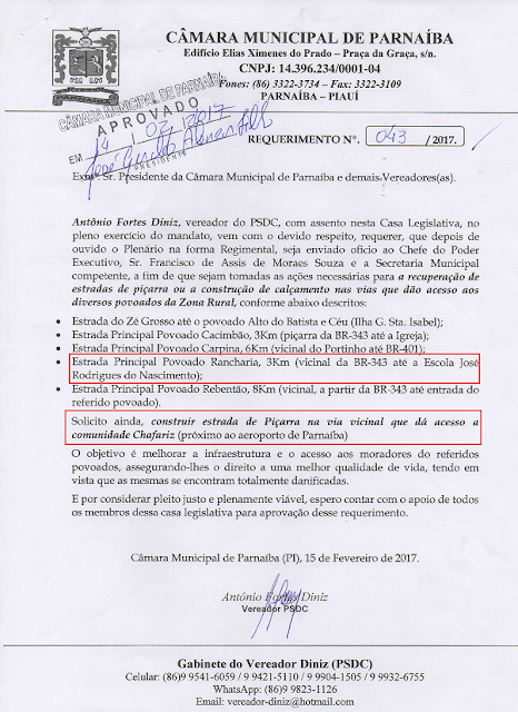 Diniz agradece construção de estrada de piçarra na zona rural de Parnaíba