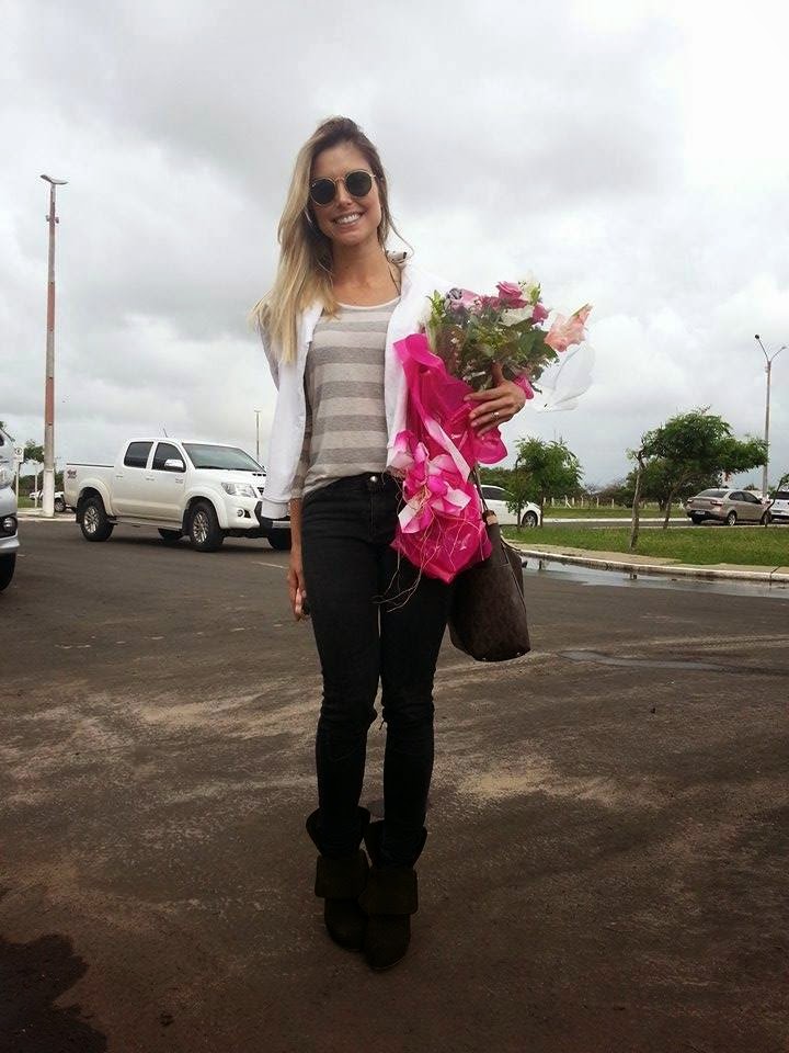 A atriz esbanjou carisma, simpatia e muito estilo ao apostar numa bota cano curto de cor verde lodo e salto anabela recortado em tom laranja. Um moleton branco jogado sobre os ombros completou o look da fashionite.