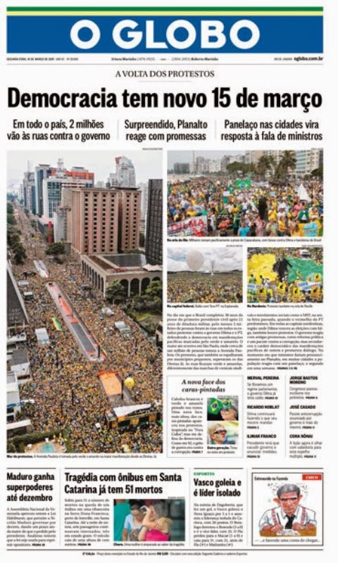 “É exatamente a mesma imprensa, o jornal O Globo, que tem a mesma manchete no dia 16 de março de 2015. Não mudaram nem as letras garrafais.
