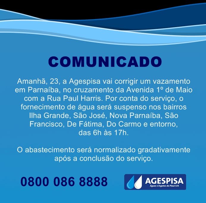 Nesta terça-feira (23), a Agespisa vai interromper o abastecimento de água em alguns bairros da cidade de Parnaíba para corrigir um vazamento localizado no cruzamento da Avenida 1º de Maio com a Rua Paul Harris.