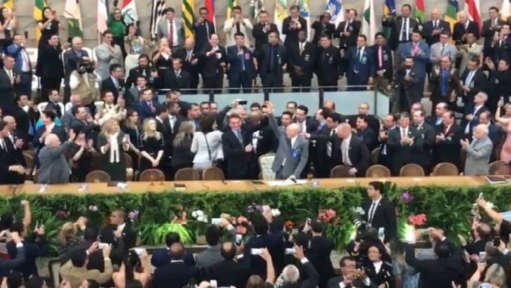 Nesta sexta, Bolsonaro encerrou o discurso de 17 minutos sob fortes aplausos e gritos de “mito”, que por algumas vezes interromperam sua fala. “A palavra, a fé, tem que estar presente em cada instituição do Brasil”, disse.