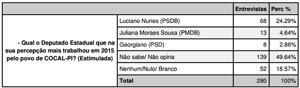 Dentro do levantamento realizado pelo Instituto BrVox no município de Cocal, localizado no norte do Estado, os eleitores puderam avaliar o trabalho dos deputados estaduais e federais mais votados na cidade, eleitos em 2014.