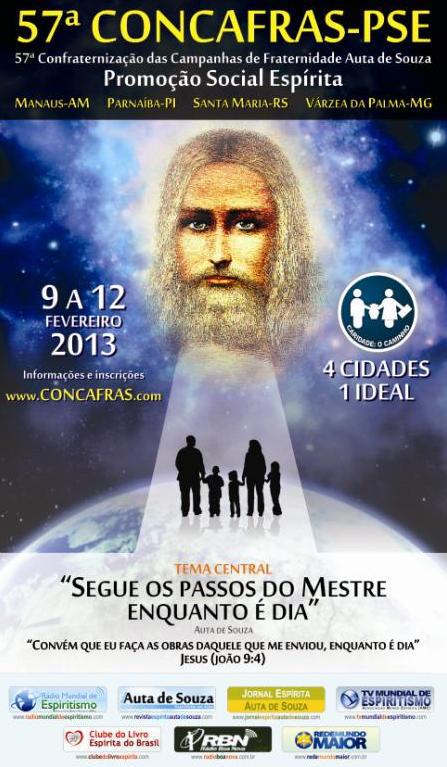 A equipe de divulgação da CONCAFRAS a ser realizada pelo Centro Espírita Chico Xavier, em Parnaíba Parnaíba, convida toda a comunidade Parnaibana a comparecer sábado, dia 12, às 19h00min, no auditório da UESPI para o evento “Todos juntos pela CONCAFRAS”, com apresentações musicais e coquetel. O evento tem por objetivo divulgar a 57ª Concafras a ser realizada no período de 9 a 12 de fevereiro na cidade de Parnaíba.