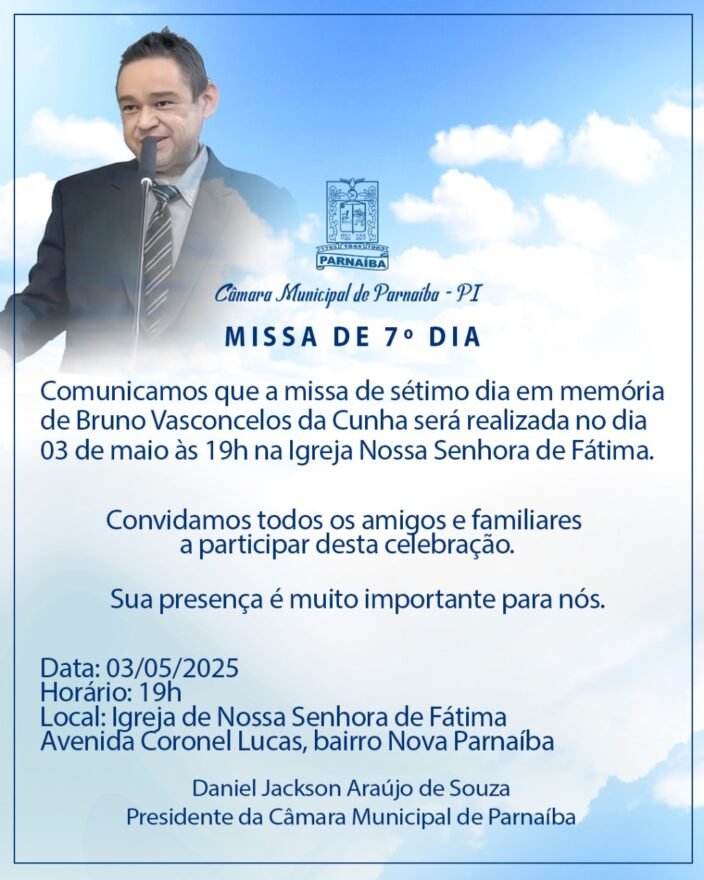 Câmara Municipal de Parnaíba convida para Missa de 7º Dia vereador Brunão Posted by Bernardo Silva on 2 de maio de 2025 in Cidade Cidade