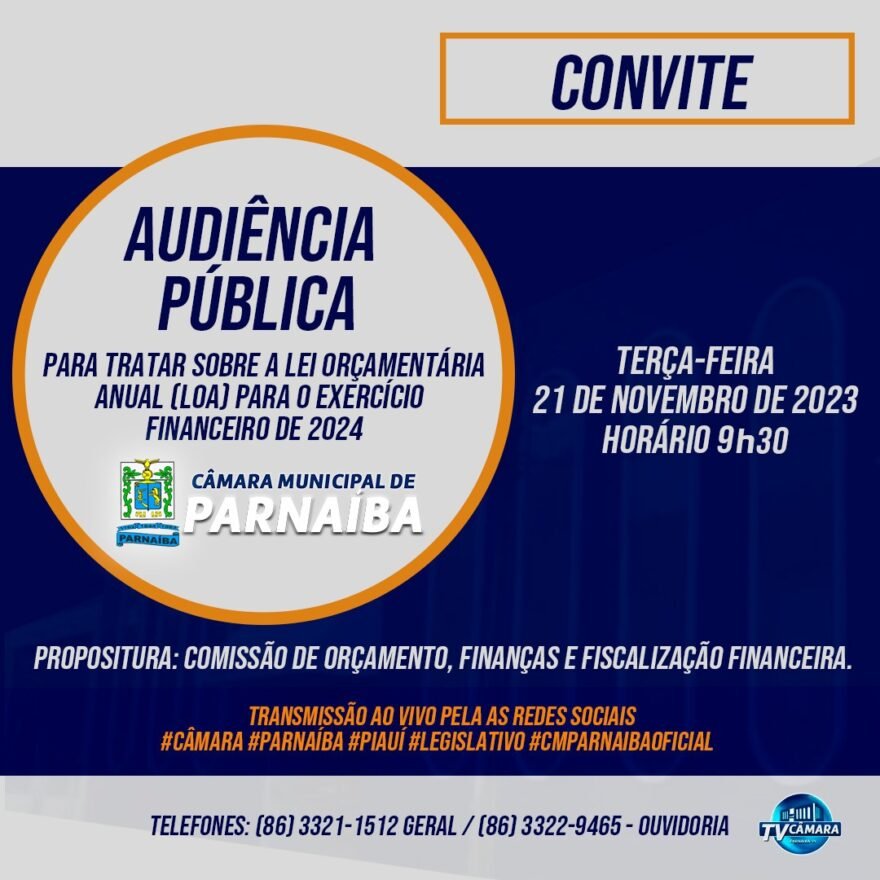 A Câmara Municipal de Parnaíba, por meio da Comissão de Orçamento, Finanças e Fiscalização Financeira, realiza nesta terça-feira (21/11) a partir das 9h30 uma audiência pública para tratar sobre a Lei Orçamentária Anual (LOA) para o exercício financeiro de 2024.