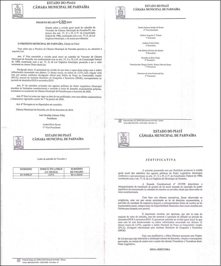 Os projetos de Lei Nº 4.625/2020 e Nº 4.626/2020, apresentados pela Mesa Diretora, vem tão somente cumprir dispositivo legal e orgânico, porém sem trazer quaisquer aumento de valores dos subsídios que estão sendo atualmente pagos aos Agentes políticos do Poder Legislativo Municipal.