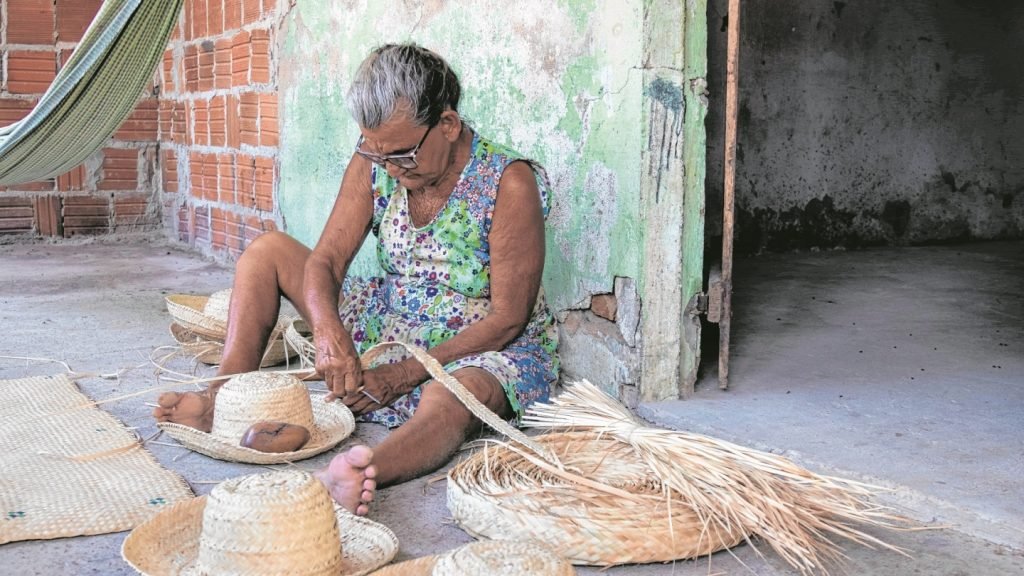 As marcas expressivas nas mãos, adquiridas ao longo dos anos, denunciam o extenso período de tempo que dona Nicinha dedica à arte de fabricar peças utilizando a palha de carnaúba na comunidade em que vive desde os primeiros anos de vida. É no Sítio Volta, interior de Jaguaruana, no Vale do Jaguaribe, que ela e outras 15 artesãs se reúnem diariamente para transformar a palha em arte.