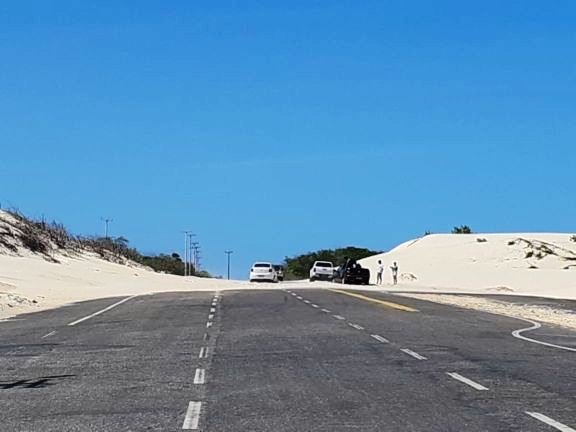 Veículos ficaram atolados na areia que cobre a pista de acesso à Lagoa do Portinho, na tarde deste domingo(1), em Parnaíba, litoral do Piauí.