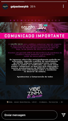 A produtora do evento ainda informou que estaria devolvendo o valor do ingresso virtual,ou reagendando o evento, com grupos de Teresina para o mês de fevereiro.  Galpão Ber é um local que têm capacidade para mais de 200 pessoas,e voltou suas atividades  há pouco mais de um mês. (WagnerRoberto)