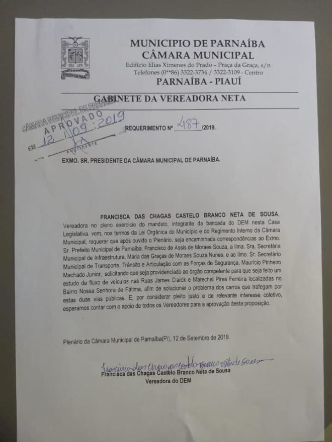 Recentemente, através do Requerimento n. 487/2019, devidamente votado e aprovado em Plenário do Legislativo, ela solicitou a realização de estudos a fim de solucionar o problema do tráfego nas Ruas James Clark e Marechal Pires Ferreira, localizadas no Bairro Nossa Senhora de Fátima.