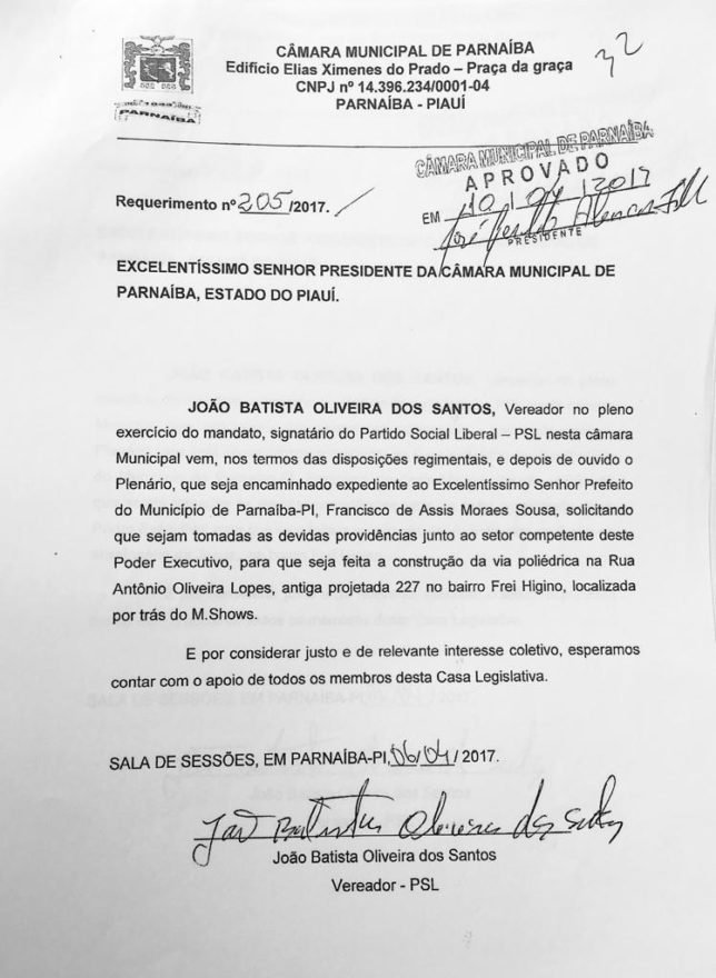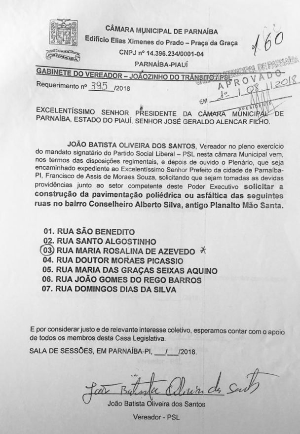 Ela informou que já esteve despachando com o Prefeito Francisco de Assis Moraes Souza – Mão Santa, bem como com a Secretária de Infraestrutura Gracinha e o Secretário de Transporte e Trânsito, Maurício Pinheiro Machado, para dar andamento a tal pedido. “A primeira providência será a realização da pavimentação asfáltica dessas vias e em seguida será feito o estudo para buscar a melhor solução para o problema”, finalizou.