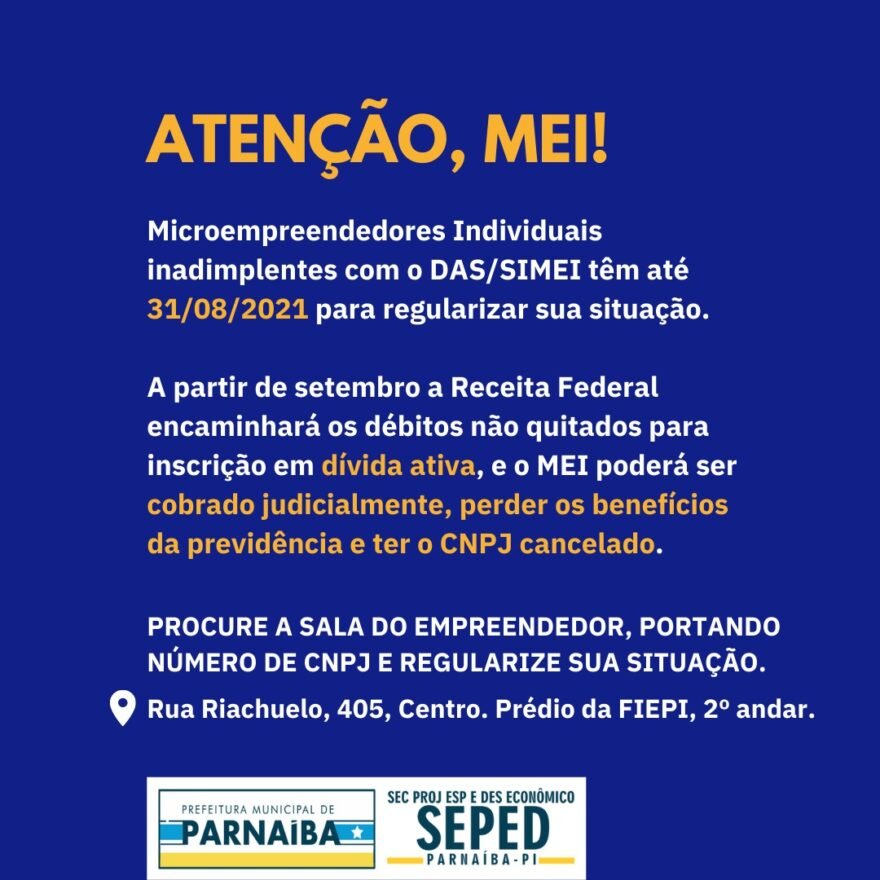 Os Microempreendedores Individuais (MEI) que possuem dívidas referentes a impostos junto à Receita Federal têm até a próxima terça-feira, 31 de agosto, para regularizarem a situação, e evitar o cancelamento do CNPJ. As pendências podem ser quitadas ou renegociadas na página do Portal do Empreendedor – https://www.gov.br/empresas-e-negocios/pt-br/empreendedor ou no portal do Simples Nacional.