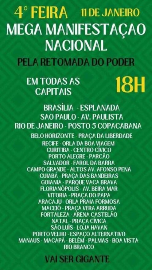 EM 25 CAPITAIS – Em um banner, cuja mensagem principal convida para uma “megamanifestação nacional pela retomada do poder”, há endereços dos atos marcados para esta quarta-feira (11/1), em 25 capitais do país.