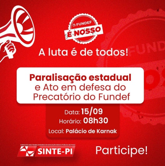 O sindicato, inclusive, realiza nesta quinta-feira (15/09), uma paralisação estadual e ato em ‘defesa do precatório do Fundef’, que será realizada na frente do Palácio de Karnak, a sede do executivo estadual.