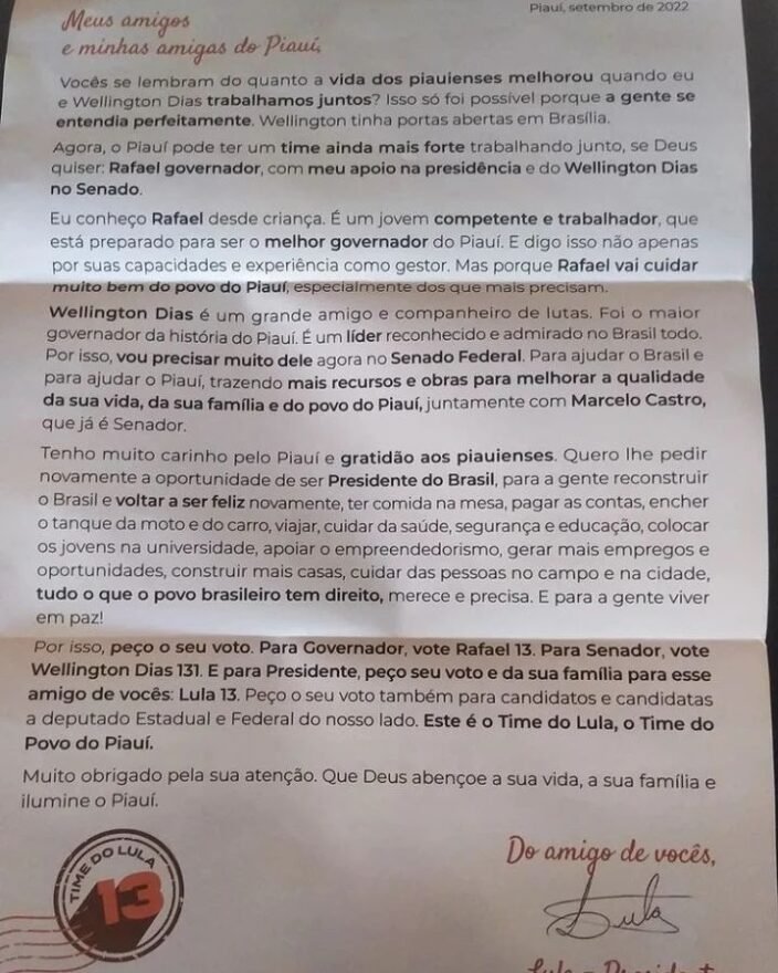 O candidato a governador do Piauí, Rafael Fonteles, está divulgando uma carta, assinada pelo candidato Lula, reafirmando quem é seu candidato.