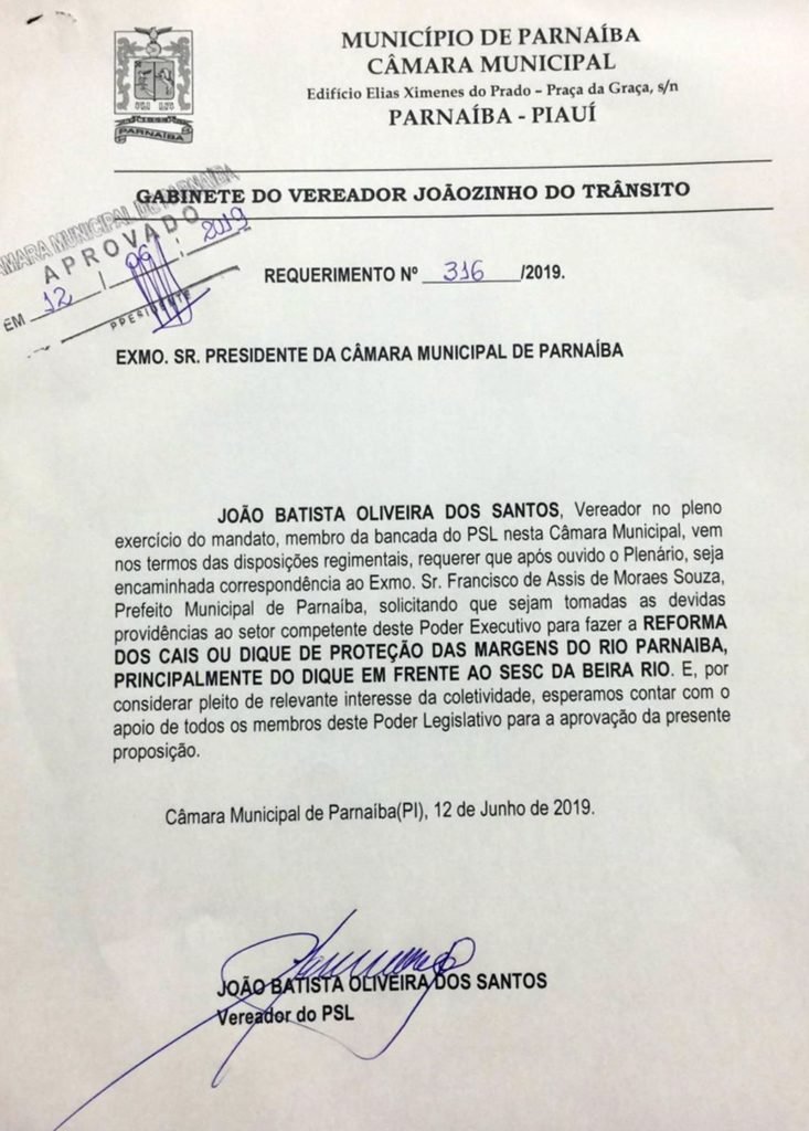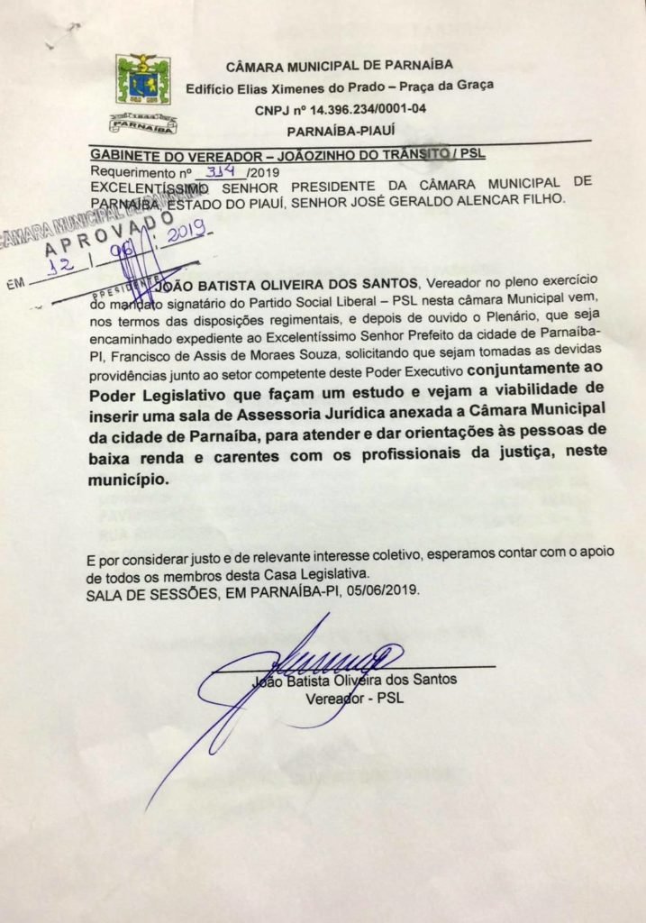 O 1º requerimento trata de um projeto inédito para instalação de um gabinete de assessoria jurídica anexo a CMP para atender e dá orientações às pessoas de baixa de renda do município de Parnaíba. Veja cópia do requerimento logo abaixo: