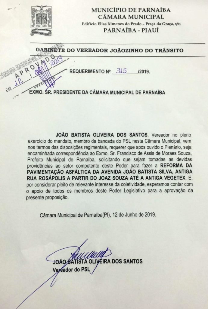 O 3º requerimento aprovado, pede a reforma de pavimentação asfáltica da Avenida Prefeito Batista Silva, (antiga Rosapólis), indo do conjunto Joaz Souza até a Vegetex.