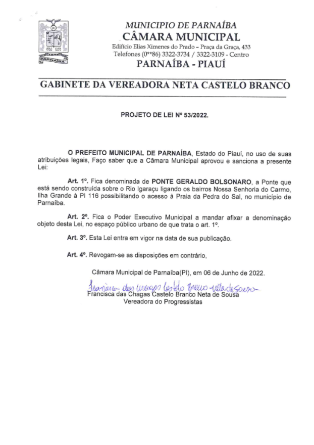 De acordo com a vereadora, “a denominação da PONTE GERALDO BOLSONARO se dá em agradecimento e atenção ao Presidente da República que com sua sensibilidade, muito tem contribuído para o crescimento de nossa cidade, com repasses financeiros nas áreas da saúde, educação, assistência social, infraestrutura e turismo, possibilitando a execução de inúmeras políticas públicas para o constante desenvolvimento da cidade de Parnaíba”.