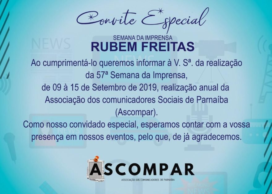 A diretoria da Associação dos Comunicadores de Parnaíba (Ascompar) concluiu a programação oficial da 57ª Semana da Imprensa “Jornalista Rubem Freitas”/2019, que este ano será realizada no período de 9 a 15 deste mês. Nesta terça-feira (3) foi iniciada a entrega de convites para todos os comunicadores e colaboradores da imprensa local.