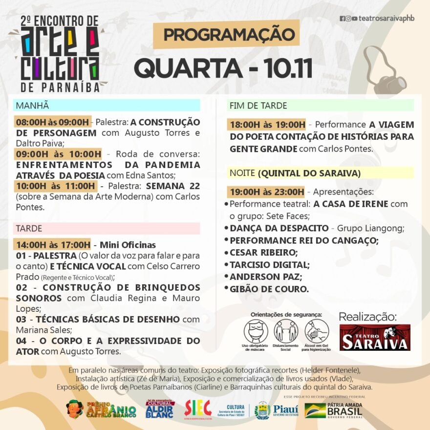 Confira a Programação de hoje(10) do 2º Encontro de Arte e Cultura de PHB Posted by Bernardo Silva on 10 de novembro de 2021 in Cidade Cidade