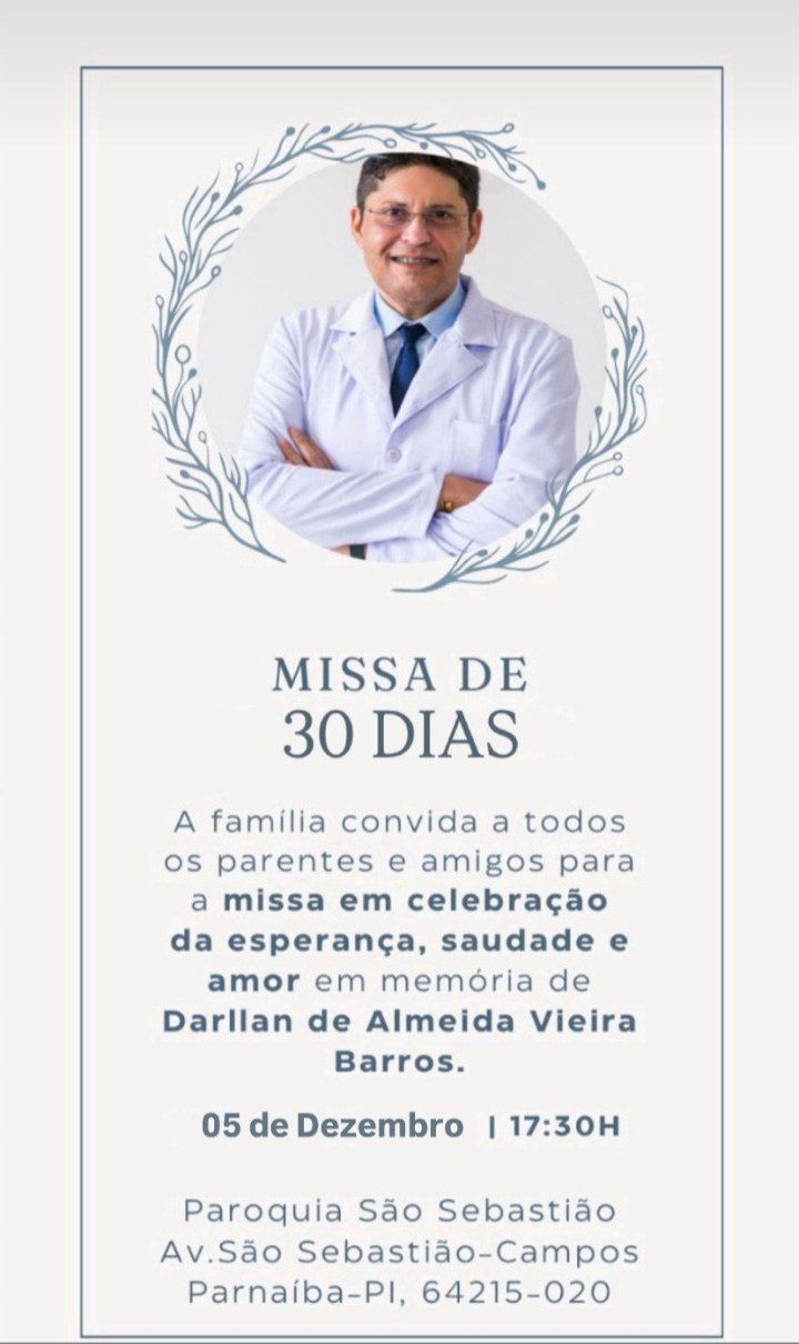 Convite para a Missa de um mês do falecimento do médico e vice-prefeito de Parnaíba Darllan Barros Posted by Bernardo Silva on 3 de dezembro de 2025 in Política Política