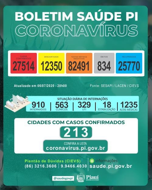 A Secretaria de Estado da Saúde (Sesapi) divulgou no boletim epidemiológico desta segunda-feira (6), que o Piauí registrou 1.003 casos e 25 óbitos pelo novo coronavírus em um prazo de 24 horas e contabiliza agora 834 mortes distribuídas entre 94 municípios. O Piauí possui 27.514 casos confirmados de Covid-19, no total.