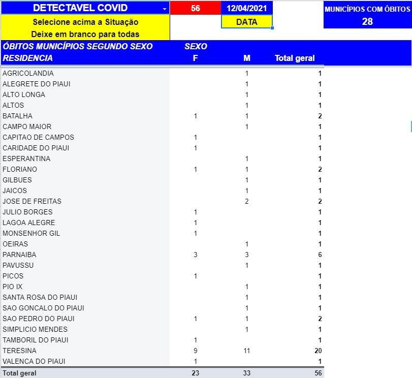 Vinte e quatro mulheres e trinta e três homens foram vítimas da Covid-19. Elas eram de Batalha  (71 anos), Capitão de Campos (60  anos), Caridade (48 anos), Floriano (89 anos), Júlio Borges (25 anos), Lagoa Alegre (82 anos). Monsenhor GIl ( 75 anos), Parnaíba (66,75 e 89 anos), Picos (58 anos),São Pedro do Piauí (49 anos), Tamboril (90 anos),  Teresina (50, 54, 62, 66, duas de 72 anos, 73, 77, duas de 78 anos) e Valença ( 87 anos).