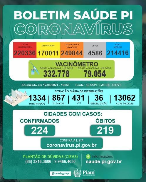 Os casos confirmados no estado somam 220.336 distribuídos em todos os municípios piauienses. Já os óbitos pelo novo coronavírus chegam a 4.586 e foram registrados em 219 municípios.