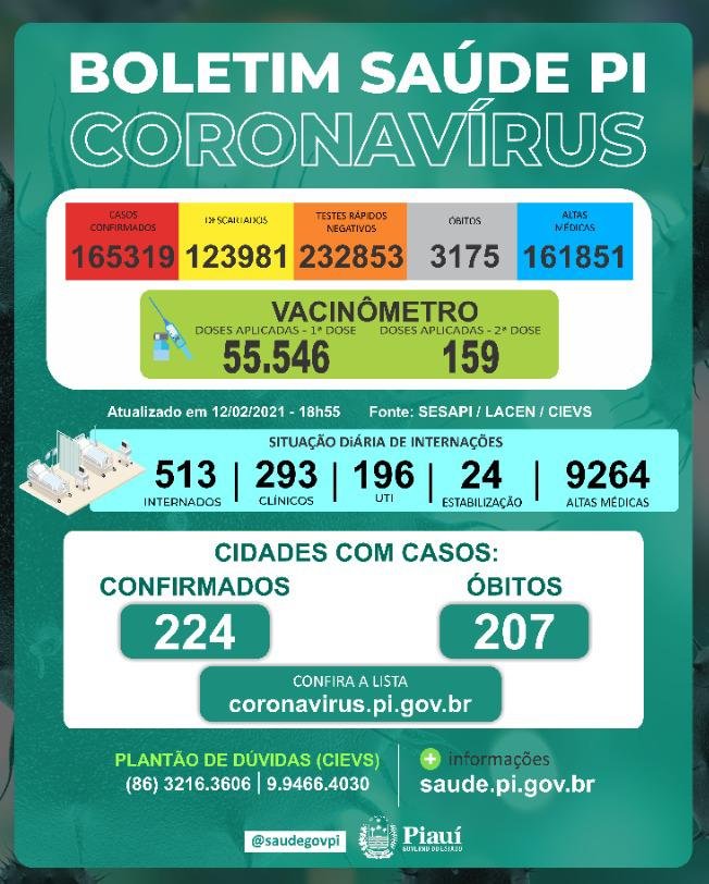 Dos leitos existentes na rede de saúde do Piauí para atendimento à Covid-19, há 513 ocupados, sendo 293 leitos clínicos, 196 UTIs e 24 em leitos de estabilização. As altas acumuladas somam 9.264 até o dia 12 de fevereiro de 2021.