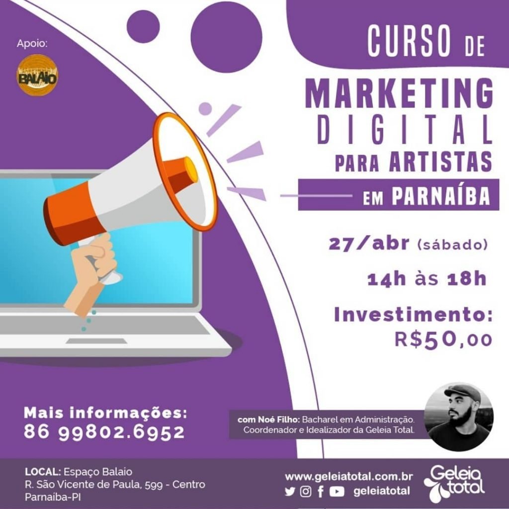 No dia 27 de abril acontecerá em Parnaíba o Curso de Marketing Digital para Artistas, ministrado por Noé Filho(Administrador, Produtor Cultural e Idealizador e Coordenador da Geleia Total), é uma ótima oportunidade para aprender conceitos, ações e dicas práticas para que você artista ou produtor cultural possa ter um alcance maior em suas redes sociais, principalmente no instagram, facebook, twitter, youtube e whatsapp.