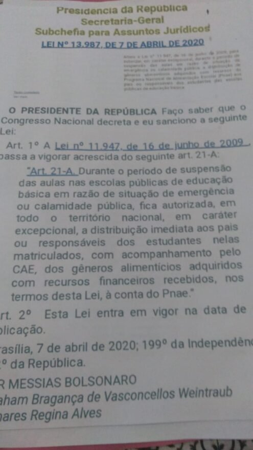1. Kit de Merenda Escolar: No dia 7 de Abril de 2020, foi sancionada a lei de N 13.987 que versa sobre a entrega imediata dos kits de merenda escolar aos pais ou responsáveis de alunos de escola pública durante o período pandêmico e enquanto tiver aula online para os alunos.