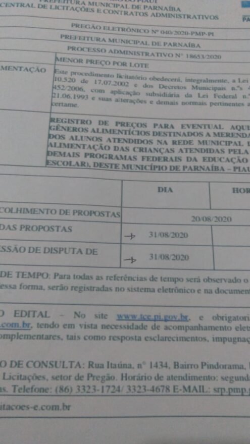 Licitação para compra de merenda datada de Agosto de 2020 com vigência de um ano.Tenho o Edital de chamada para a compra de alimentos não perecíveis de forma percapta destinada aos 19.000 alunos da Rede Municipal. Porém as escolas estão entregando os kits por família ou apenas para quem tem bolsa família. O que contraria a lei que afirma que os kits são entregues por aluno.