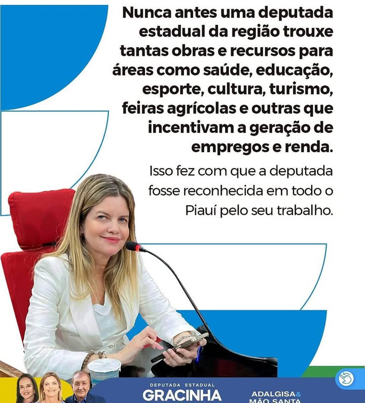 Nunca antes na história do Piauí se mentiu tanto em torno do trabalho de uma deputada estadual como nos últimos dois anos, depois que a filha do ex-prefeito Mão Santa, a Gracinha Moraes Sousa Nunes, ganhou um mandato de deputada. Basta ler a propaganda acima que em nada condiz com a realidade local. Muita espuma para o pouco que é entregue, tanto na saúde quanto na educação. E nem se fala na realização de feiras agrícolas, tampouco em geração de emprego e renda porque não existem. A não ser que encher a prefeitura de cargos comissionados, presenteando muitos bajuladores, seja gerar emprego e renda.