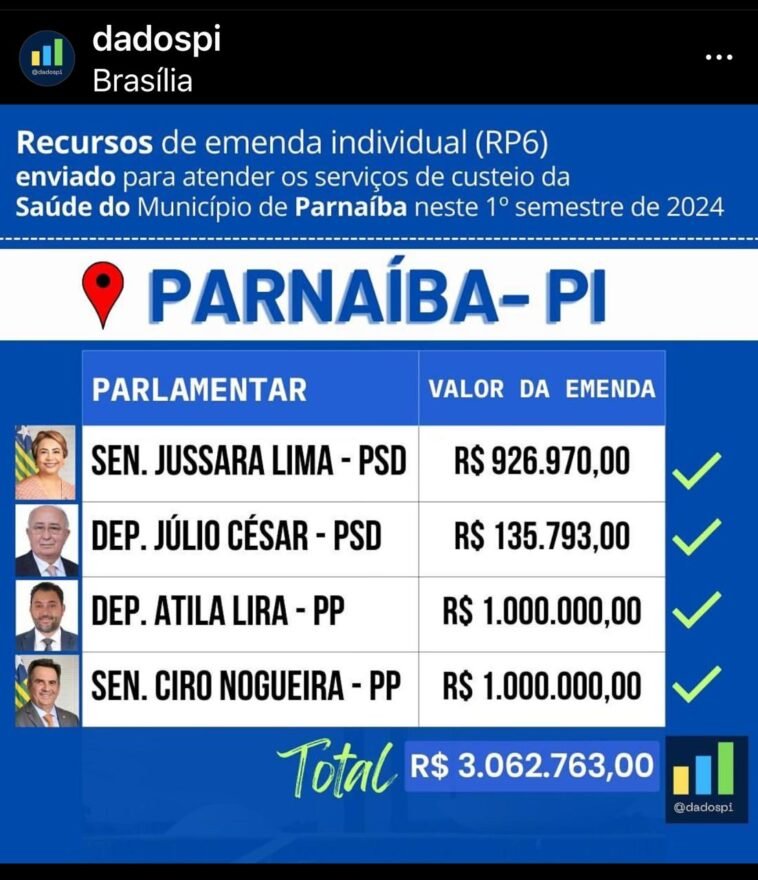 Mas ela mente ao fazer tal afirmação. E, dizem os mais velhos: quem mente, rouba. A foto acima mostra que parlamentares do Piauí enviaram mais de 3 milhões de reais de suas emendas individuais para Parnaíba. Em que tais recursos vão ser ou estão sendo gastos, ninguém sabe. E nem ela diz, tampouco a administração municipal é cobrada por quem de di9reito, ou seja, os vereadores, a oposição. E assim ela segue fazendo festas e comícios, para iludir os incautos parnaibanos, a fim de convencer o eleitorado a votar em alguém que ela apresenta como o Novo Francisco, um cidadão que não tem história e nem experiência alguma de coisa nenhuma, embora esteja na gestão há mais de 7 anos e até ser lançado como pré-candidato a prefeito da Gracinha, era apenas um ilustre desconhecido.